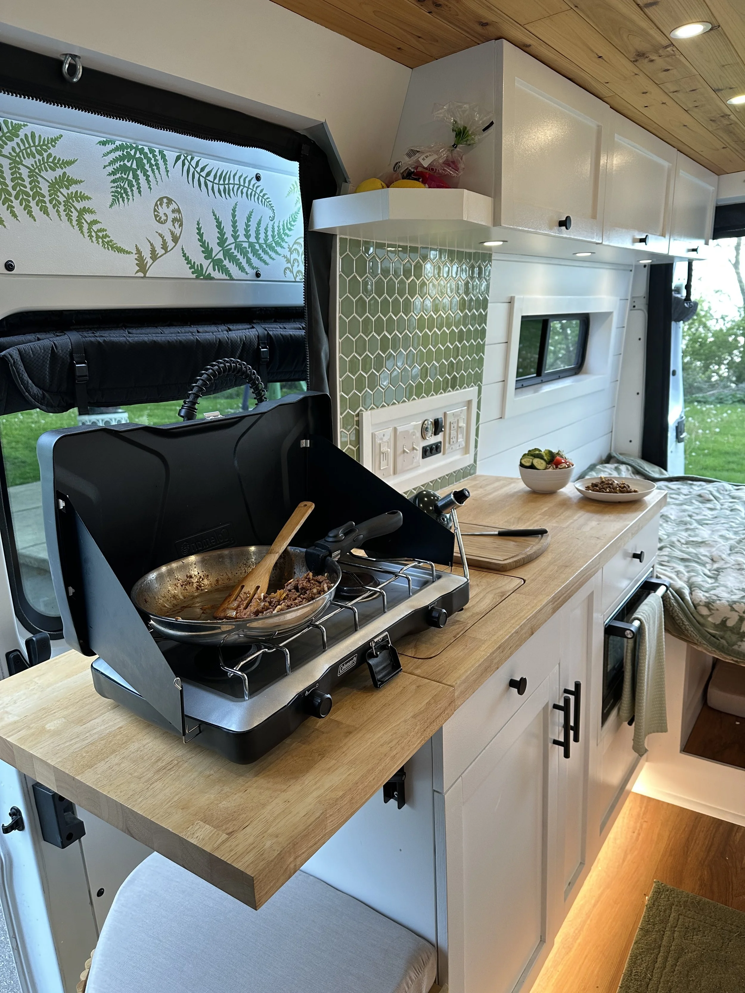 I’m still very happy with my decision to use a portable two burner propane cooktop.
