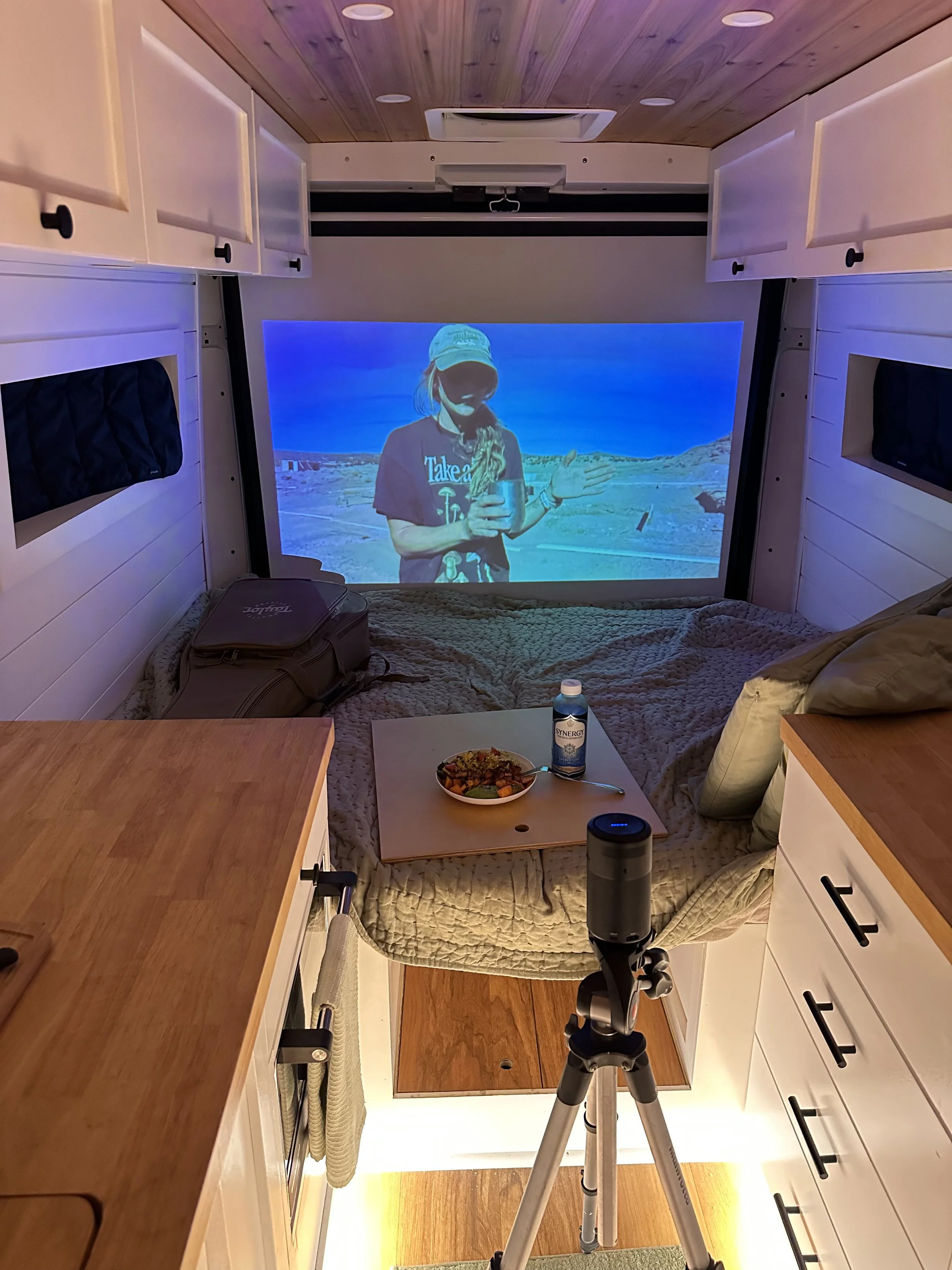 70” projector screen on the back ledge of my bed area