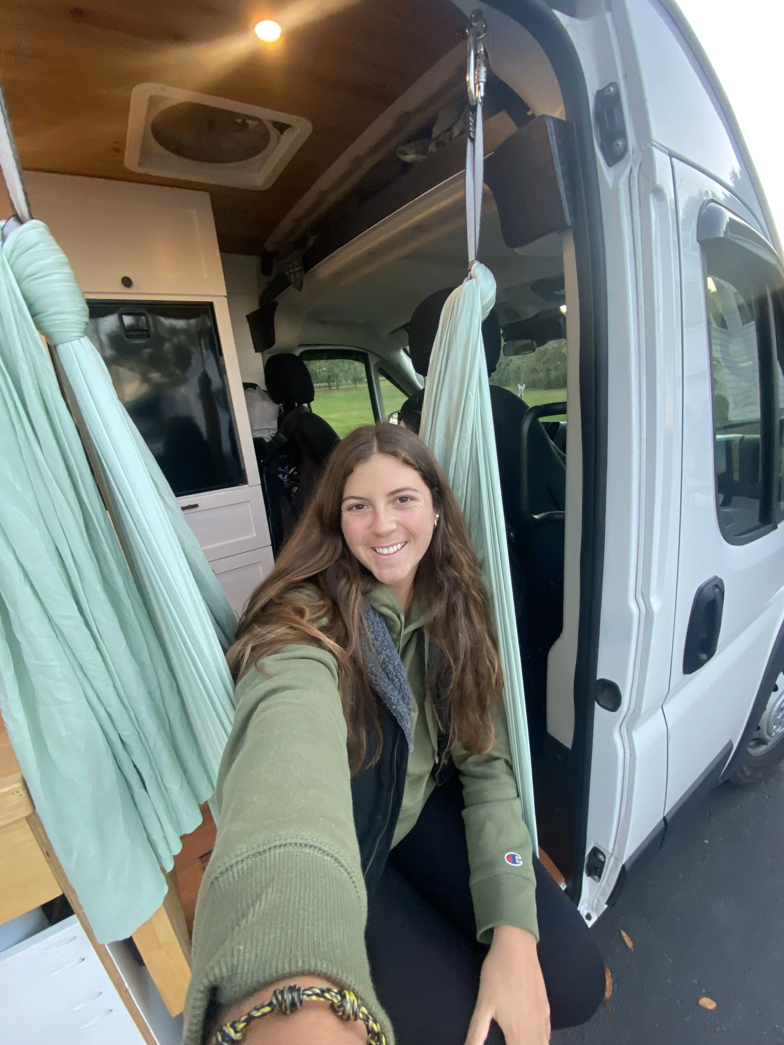 An aerial silk that I can use as a swing in the sliding door and rear door entrance, as well as a hammock the full length f the van, front to back.